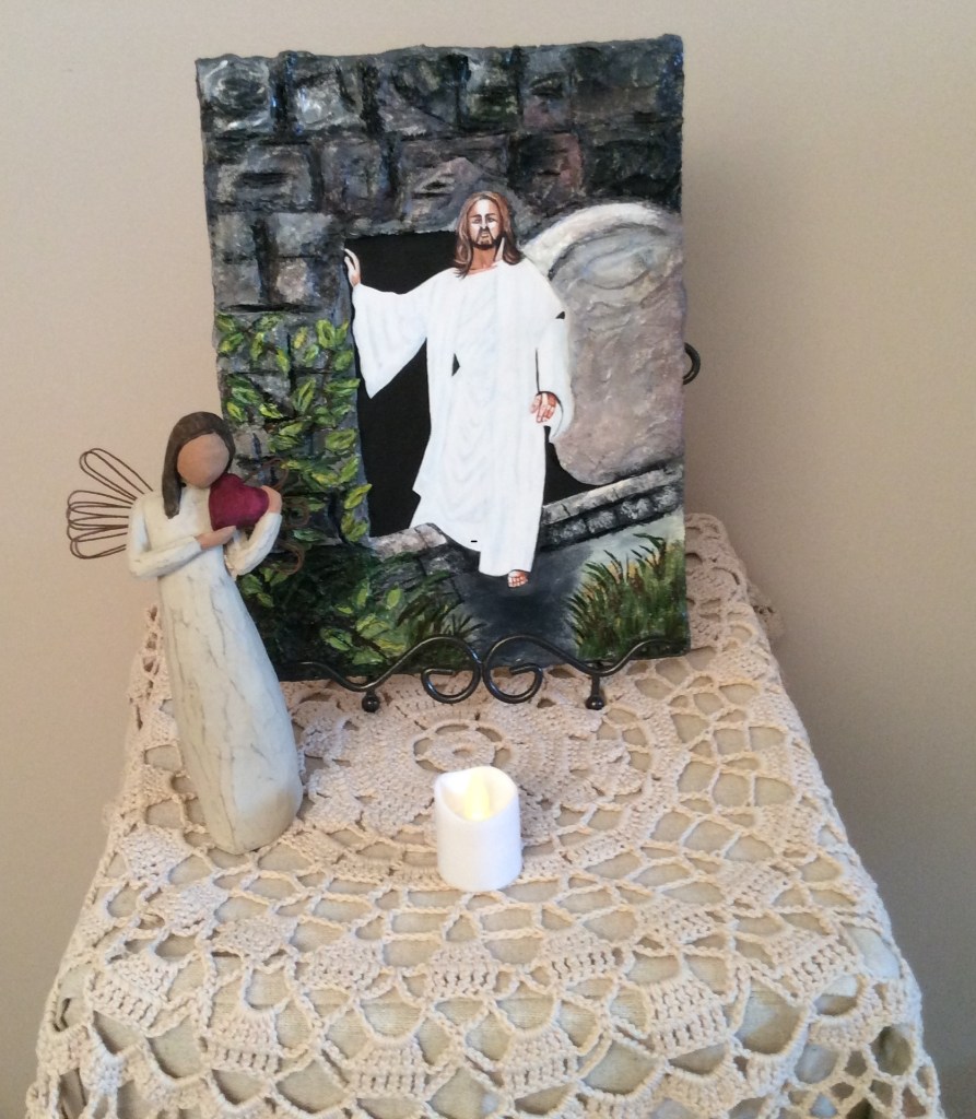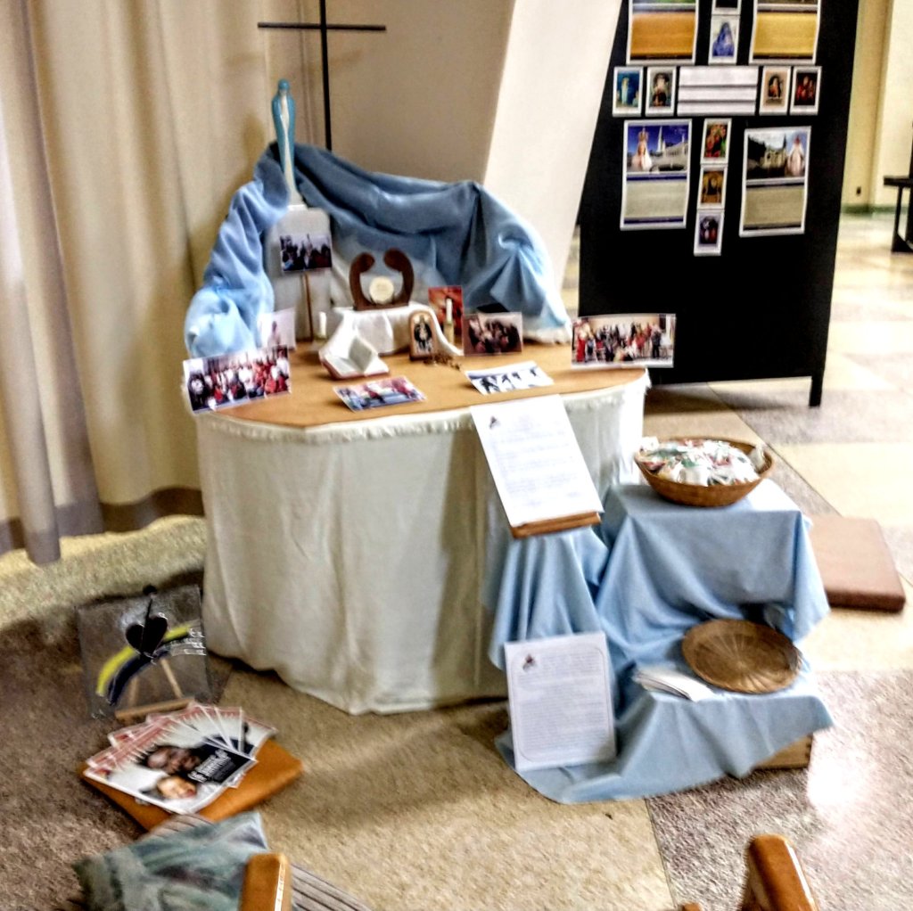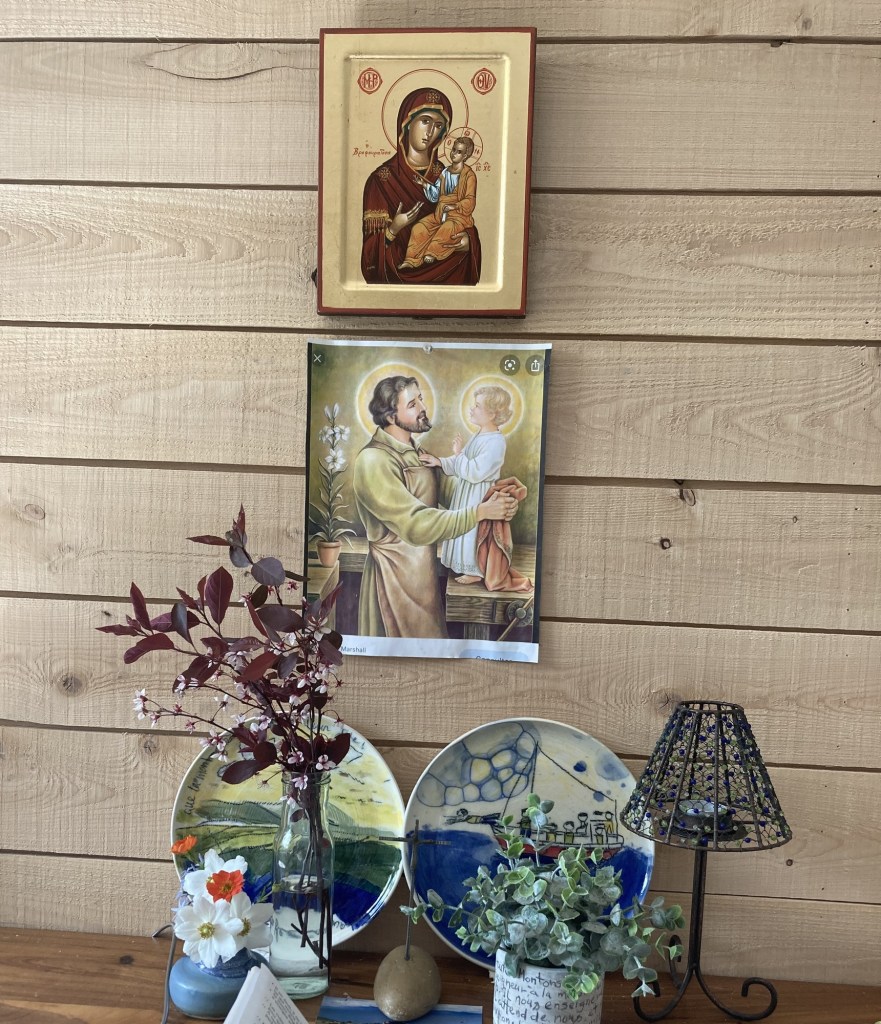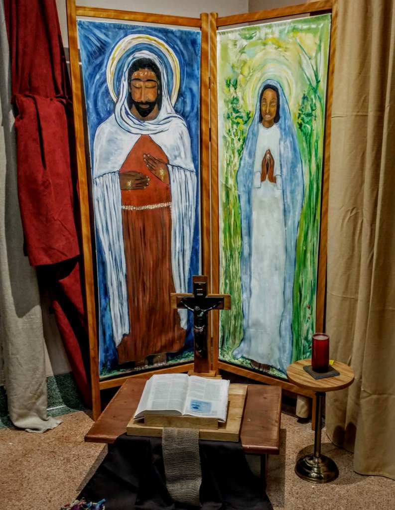 Aussi, lorsque j’ai commencé à préparer mon matériel pour mon coin de prière, déjà je sentais que ce n’était pas juste une exposition mais une expérience de prière et de rencontre avec Jésus et Marie. En les choisissant pour mon diptyque, je les invitais dans mon espace sacré et dans cette grande aventure avec le RACEF et le sanctuaire Notre Dame du Cap.