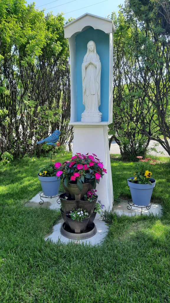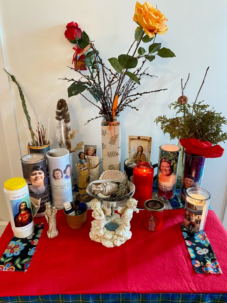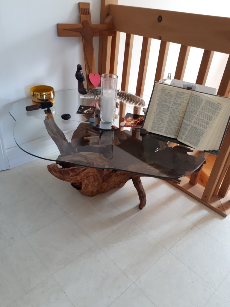 « Le 12 mai, à l’invitation de Manu qui connaît mon attrait pour la prière vécue notamment dans mon oratoire domestique, j’ai sauté à pieds joints dans le projet emballant de l’exposition estivale de terres sacrées chez soi!
