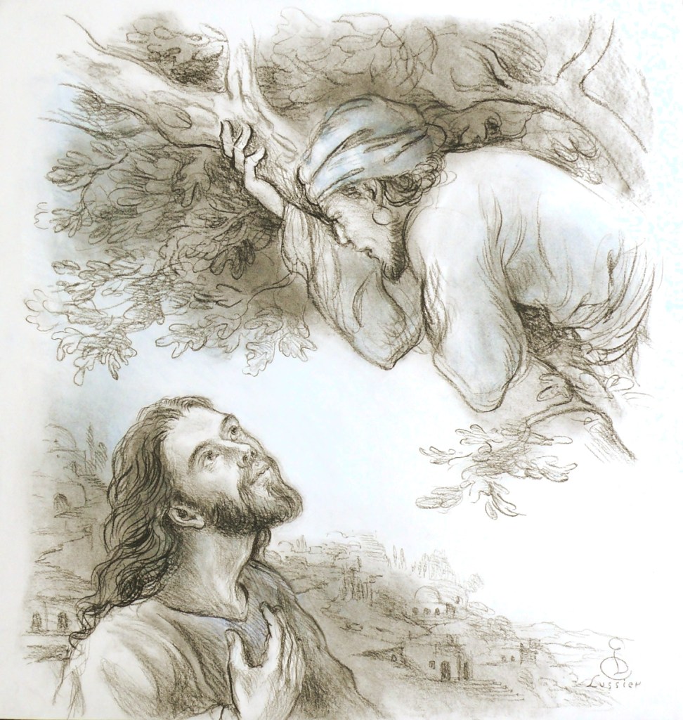 Tout n’est pas dit dans cette image. J’ai voulu m’en tenir à une suggestion, à une impression première du récit en moi. Je ne sais pas encore ce qui va advenir, ce que va faire Jésus. Il y a ce petit homme rusé qui veut voir Jésus et Jésus qui s’arrète en regardant en lui un enfant de Dieu, son frère. L’image apparait lentement en même temps que l’histoire de cette rencontre qui va changer la vie de Zachée.