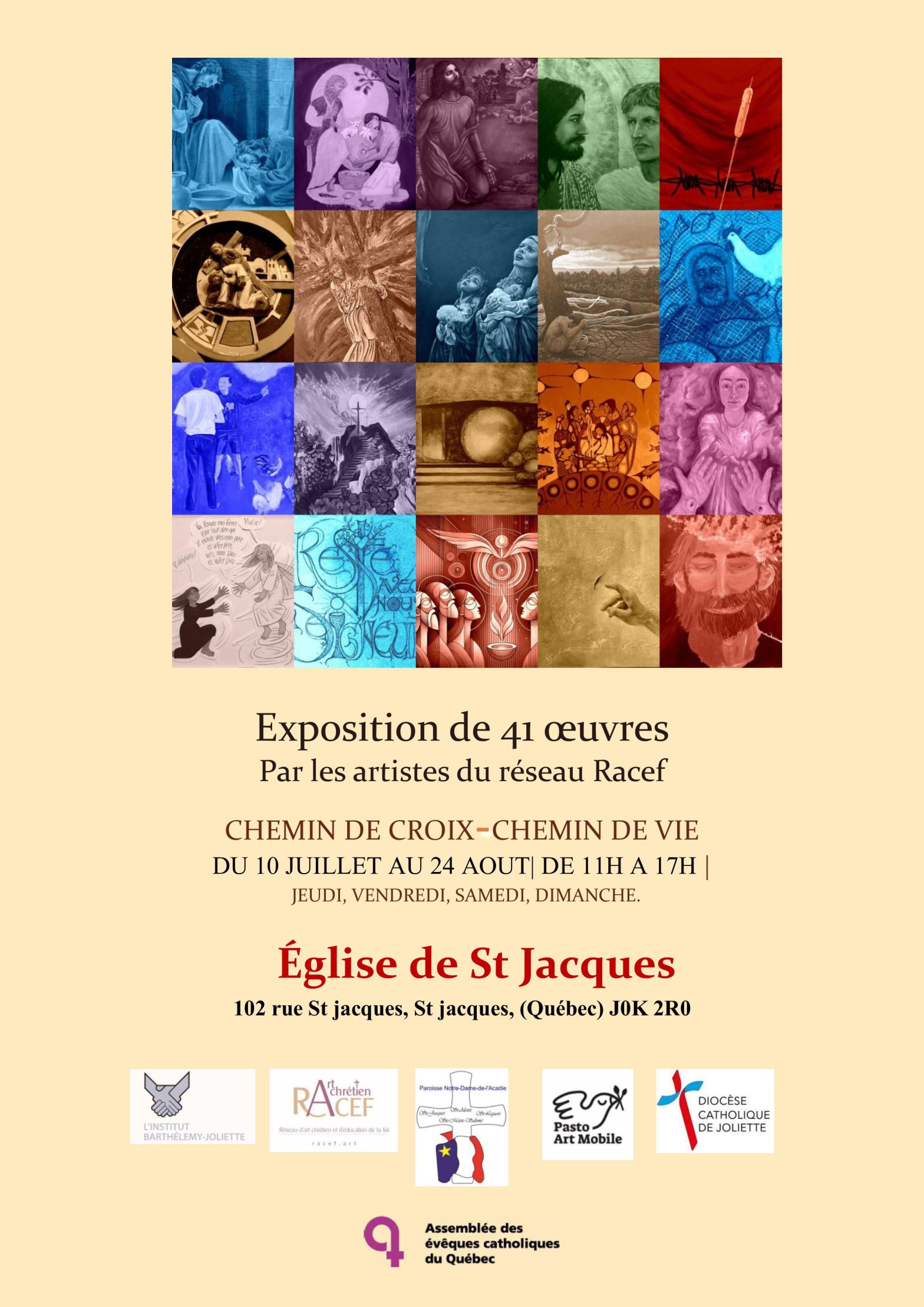 Inaugurée à la cathédrale de Joliette pendant la Semaine Sainte 2025, l’exposition itinérante du RACEF « Chemin de Croix-Chemin de vie » est maintenant offerte à Saint-Jacques! Durant les mois d’été, les oeuvres du réseau d’artistes du RACEF sont présentées à l’église Saint-Jacques de Montcalm dans Lanaudière, une église à la haute valeur patrimoniale. L’exposition est offerteLire la suite « L’église de Saint-Jacques accueille « Chemin de Croix – Chemin de vie »! »